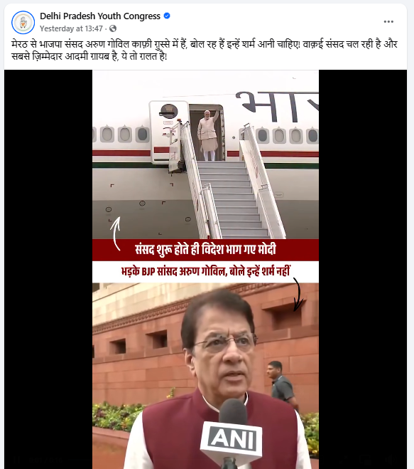 वायरल वीडियो 16 सेकेंड का है, जिसमें दो दृश्य मौजूद हैं. ऊपर वाले दृश्य में पीएम मोदी हवाई जहाज में सवार होते हुए दिखाई दे रहे हैं और नीचे वाले दृश्य में मेरठ से भाजपा सांसद अरुण गोविल समाचार एजेंसी एएनआई को बयान देते हुए कहते हैं कि “मुझे समझ में नहीं आता, ये जिन लोगों ने इन्हें चुनकर भेजा, उनको ये क्या जवाब देंगे? क्या ये करने के लिए इनकी जनता ने इनको चुनकर यहां भेजा है. कितनी शर्म की बात है ये. पार्लियामेंट चलाने में कितना खर्चा होता है, उस खर्चों का भी इनको ध्यान नहीं है. इन्हें देश की किसी चीज का ध्यान नहीं है”.