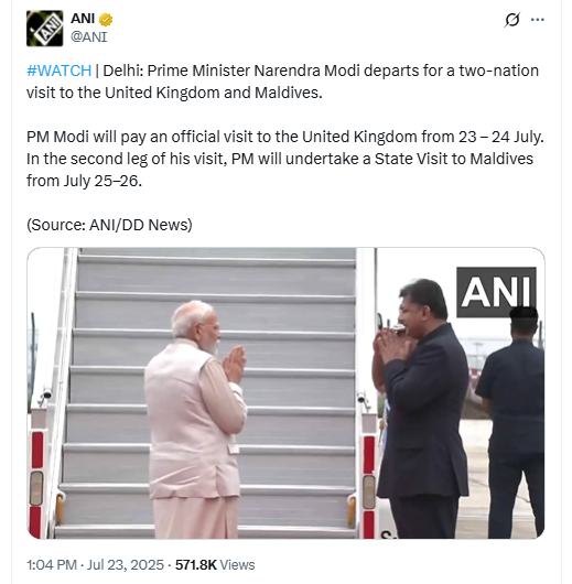 अरुण गोविल द्वारा संसद में मौजूद नहीं रहने और विदेश जाने के लिए पीएम मोदी की आलोचना किए जाने के दावे से वायरल हुए वीडियो की पड़ताल के लिए, सबसे पहले हमने ऊपर वाले दृश्य की पड़ताल की. इस दौरान हमने पाया कि यह दृश्य पीएम मोदी द्वारा ब्रिटेन और मालदीव की यात्रा पर जाने के दौरान का है. जिसे समाचार एजेंसी एएनआई ने ही 23 जुलाई 2025 को जारी किया था.