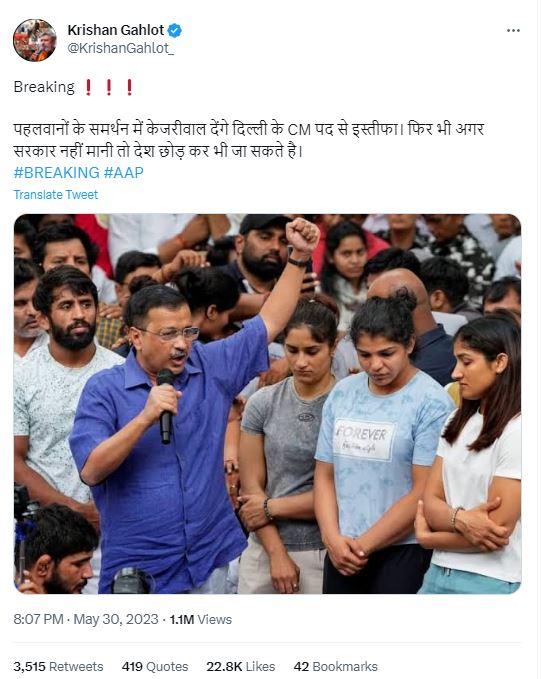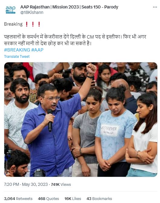 इसके बाद हमने वायरल दावे को ट्विटर पर सर्च किया। हमें आप राजस्थान के नाम से बने एक पैरोडी ट्विटर अकाउंट द्वारा 30 मई को किया गया ट्वीट मिला। इस ट्वीट में लिखे कैप्शन के मुताबिक, “पहलवानों के समर्थन में केजरीवाल देंगे दिल्ली के CM पद से इस्तीफा। फिर भी अगर सरकार नहीं मानी तो देश छोड़ कर भी जा सकते हैं।”