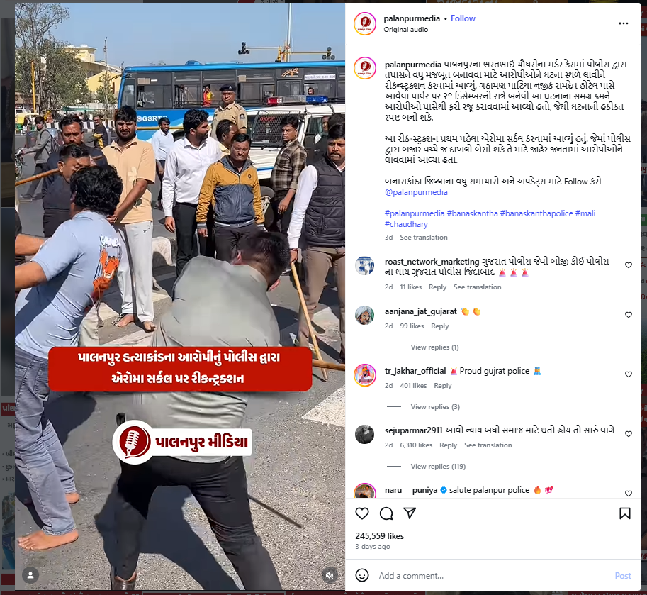 वीडियो के साथ गुजराती कैप्शन में बताया गया था कि पालनपुर में बीते 20 दिसंबर को भरत चौधरी नाम के एक शख्स की हत्या कर दी गई थी, जिसके बाद पुलिस ने जांच के दौरान आरोपियों को धटनास्थल पर ले जाकर सीन रीक्रिएट किया था.