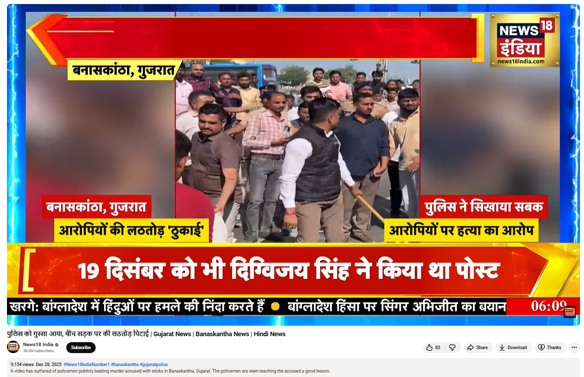 ऊपर मिली जानकारी के आधार पर गूगल सर्च किया तो हमें न्यूज 18 इंडिया के यूट्यूब अकाउंट से 28 दिसंबर 2025 को अपलोड की गई वीडियो रिपोर्ट मिली, जिसमें वायरल वीडियो से जुड़े दृश्य मौजूद थे. इस रिपोर्ट में भी वीडियो को गुजरात के बनासकांठा के पालनपुर और भरत चौधरी हत्याकांड का बताया गया था.