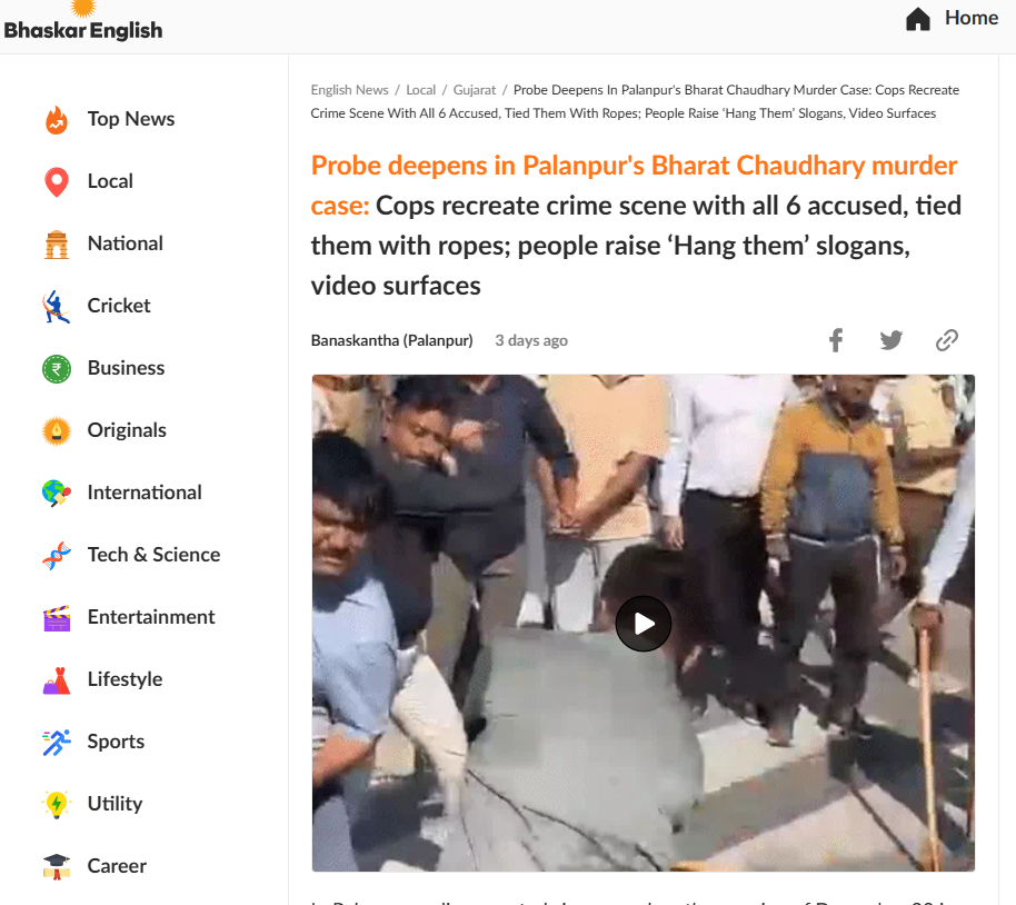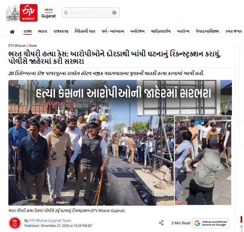 इस रिपोर्ट में भी बताया गया था कि पालनपुर के गादलवाड़ा गांव के एक युवक भरत चौधरी की हत्या के मामले में पुलिस ने आठ अलग-अलग टीमें बनाकर छह आरोपियों को गिरफ्तार किया था. अदालत में पेश किए जाने के बाद आरोपियों का पुलिस रिमांड मिलने के बाद पुलिस उन लोगों को 27 दिसंबर को घटना स्थल पर लेकर गई थी. जहां लोगों का भारी आक्रोश देखने को मिला. इस दौरान पुलिस पर आरोपियों को सार्वजनिक रूप से लाठियों से पीटने का आरोप भी लगा था.