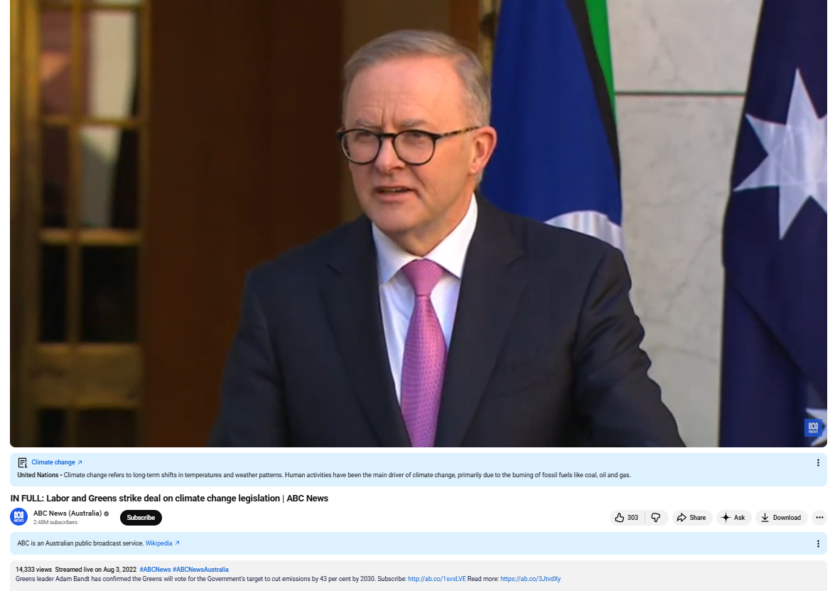 इसके बाद हमने ऊपर मिली जानकारियों के आधार पर 3 अगस्त 2022 को ऑस्ट्रेलियाई प्रधानमंत्री एंथनी अल्बनीज़ द्वारा किए गए प्रेस कांफ्रेंस का वीडियो खोजा. इस दौरान हमें यह वीडियो ऑस्ट्रेलिया की संसद की वेबसाइट पर मिला. इसमें मौजूद दृश्य वायरल वीडियो में दिख रहे दृश्यों से मेल खा रहे थे. इस पूरे प्रेस कांफ्रेंस में उन्होंने क्लाइमेट चेंज बिल से जुड़े सवालों के जवाब दिए थे.