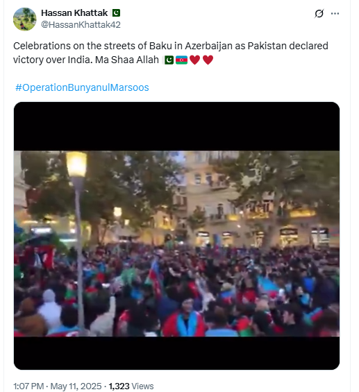 वीडियो को कई प्रो-पाकिस्तान X हैंडल द्वारा वायरल दावे वाले अंग्रेजी कैप्शन के साथ शेयर किया गया है, जिसमें लिखा हुआ है “पाकिस्तान द्वारा भारत पर जीत की घोषणा पर बाकू-अज़रबैजान की सड़कों पर जश्न”.