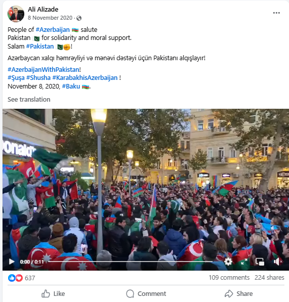 खोजने पर हमें 8 नवंबर 2020 में पाकिस्तान में अजरबैजान के राजदूत रहे अली अलीज़दा के फेसबुक अकाउंट से पोस्ट किया गया वह वीडियो भी मिला, जिसमें लोग पाकिस्तान-पाकिस्तान चिल्ला रहे हैं. वीडियो के साथ कैप्शन में उन्होंने तारीख के तौर पर इसे 8 नवंबर 2020 का ही बताया था.