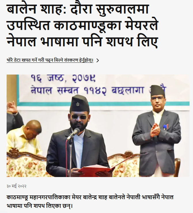 खोजने पर हमें 30 मई 2022 को बीबीसी नेपाली की वेबसाइट पर भी बालेन शाह के काठमांडू मेयर पद की शपथ लेने से जुड़ी खबर प्रकाशित हुई मिली। रिपोर्ट में वायरल क्लिप से जुड़े दृश्य फीचर इमेज के रूप में मौजूद हैं। रिपोर्ट में बताया गया है कि काठमांडू मेट्रोपॉलिटन सिटी के मेयर बालेन ने नेपाली भाषा के अलावा नेवाड़ी भाषा में भी पद और गोपनीयता की शपथ ली। इसके बाद उन्होंने उपमहापौर के रूप में सुनीता सुनीता डांगोल को भी शपथ दिलाई थी। शपथ लेने के बाद बालेन ने पत्रकारों से बात करते हुए कहा था कि जब तक काठमांडू का कचरा प्रबंधन पूरा नहीं होता, तब तक वह अन्य कार्यों को प्राथमिकता नहीं देंगे।