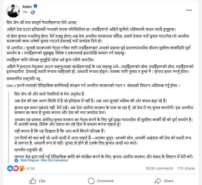 जांच के दौरान 10 सितंबर को बालेन के फेसबुक अकाउंट से किया गया एक पोस्ट मिला। इस पोस्ट में उन्होंने Gen-Z और नेपाली नागरिकों को संबोधित करते हुई कई बातें लिखी हैं। इस पोस्ट में बालेन ने नेपाल की पूर्व मुख्य न्यायाधीश सुशीला कार्की को देश की अंतरिम पीएम बनाने के समर्थन में बात की है। उन्होंने लिखा है, ‘प्रिय Gen-Z और सम्पूर्ण नेपाली जन, इस समय देश एक ऐसे ऐतिहासिक मोड़ पर खड़ा है, जहाँ स्थितियां पूरी तरह से अनोखी और विशेष हैं। आप सभी अब सुनहरे भविष्य की दिशा में कदम बढ़ा रहे हैं। कृपया इस समय घबराएं नहीं, धैर्य रखें। आपका यह प्रस्ताव अंतरिम सरकार का नेतृत्व करने के लिए पूर्व मुख्य न्यायाधीश श्री सुशीला कार्की जी को पूर्ण समर्थन है। मैं आपकी समझ, विवेक और एकता का तहे दिल से सम्मान करना चाहता हूँ।” पोस्ट में उन्होंने नेपाल के राष्ट्रपति से Gen-Z द्वारा लायी गई ऐतिहासिक क्रांति को संरक्षित करने के लिए अंतरिम सरकार का गठन और संसद का विघटन शीघ्र किए जाने की मांग की है।