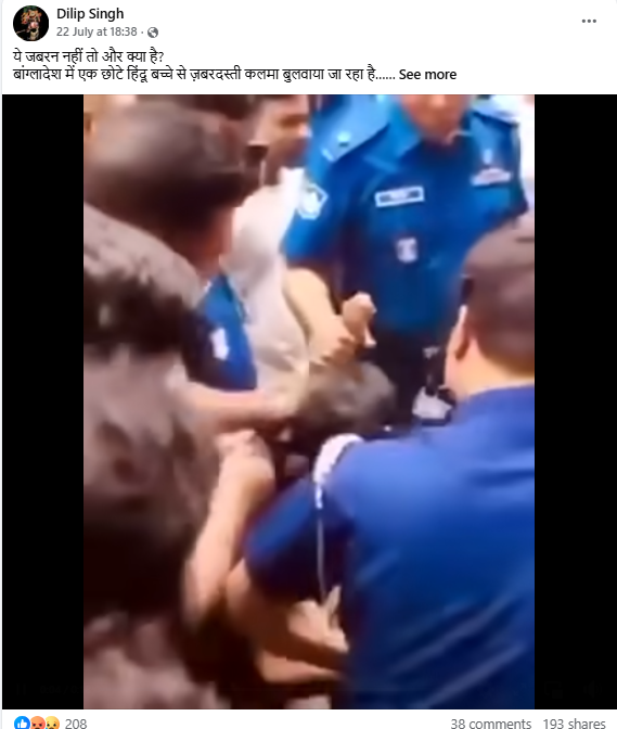 वीडियो को X पर वायरल दावे वाले एक लंबे कैप्शन के साथ शेयर किया गया है, जिसमें लिखा हुआ है “ये जबरन नहीं तो और क्या है? बांग्लादेश में एक छोटे हिंदू बच्चे से ज़बरदस्ती कलमा बुलवाया जा रहा है. पीछे से आवाज़ आ रही है – “ला इलाहा” और सामने पुलिस खड़ी है. मौलवी की आज्ञा पर सब कुछ हो रहा है”.