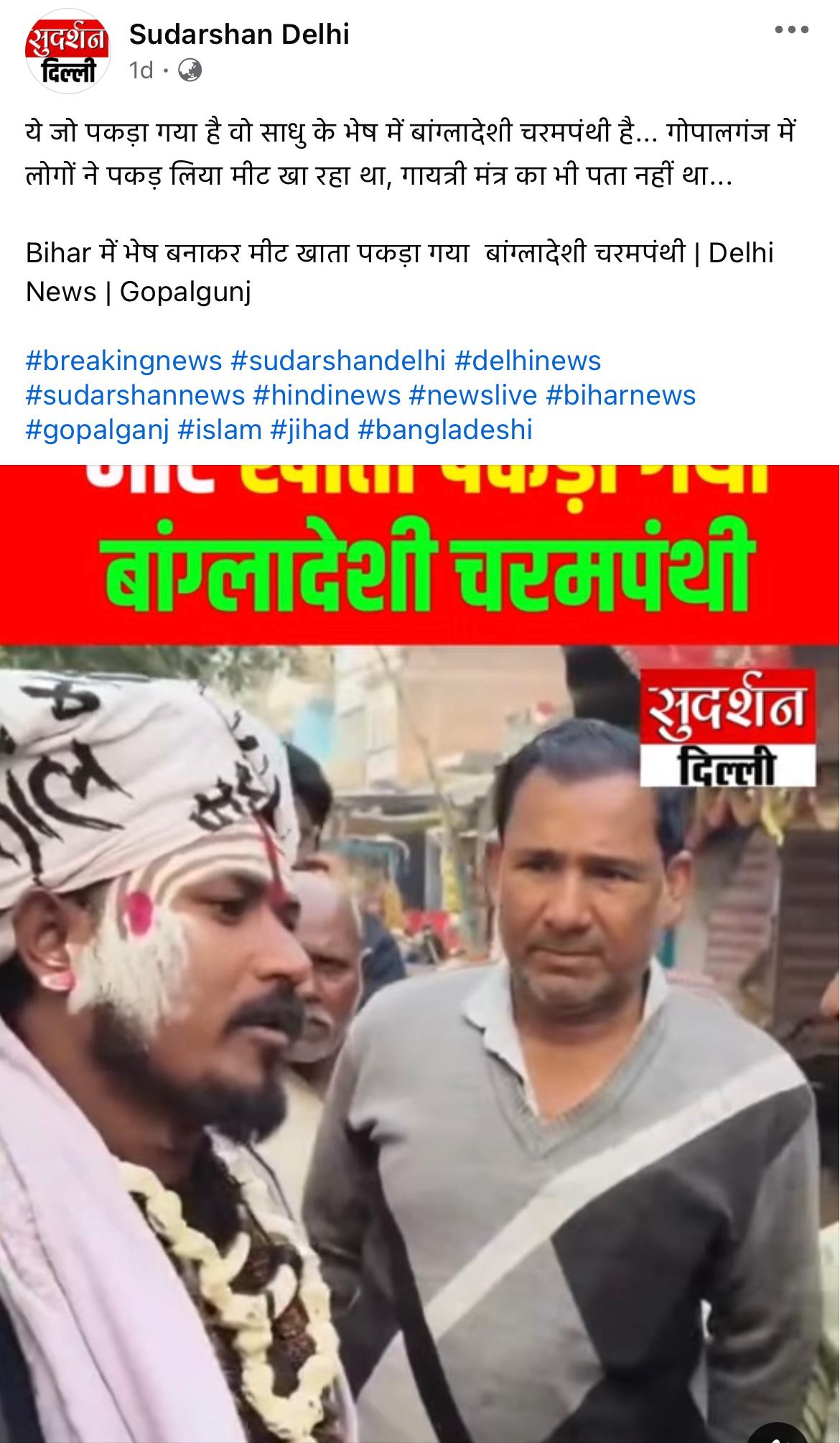 यह वीडियो एक्स और फ़ेसबुक पर व्यापक रूप से शेयर किया जा रहा है. सुदर्शन न्यूज़ दिल्ली ने वीडियो पोस्ट करते हुए लिखा, “ये जो पकड़ा गया है वो साधु के भेष में बांग्लादेशी चरमपंथी है… गोपालगंज में लोगों ने पकड़ लिया, मीट खा रहा था, गायत्री मंत्र का भी पता नहीं था.” पोस्ट का आर्काइव यहां देखें. इसी दावे के साथ वायरल अन्य पोस्ट यहां, यहां और यहां देखें.