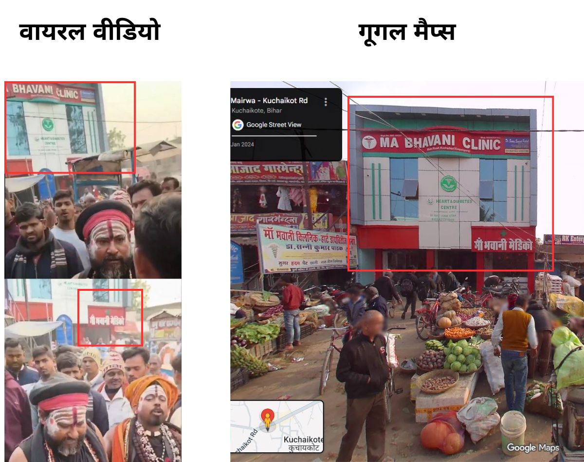 वायरल वीडियो की जांच में हमने पाया कि यह वीडियो बिहार के गोपालगंज ज़िले के कुचायकोट क्षेत्र का है. वीडियो के बैकग्राउंड में दिख रहे ‘भवानी क्लिनिक’, ‘हार्ट एंड डायबिटीज सेंटर’ और ‘माँ भवानी मेडिको’ को गूगल मैप्स पर सर्च करने पर लोकेशन की पुष्टि होती है.