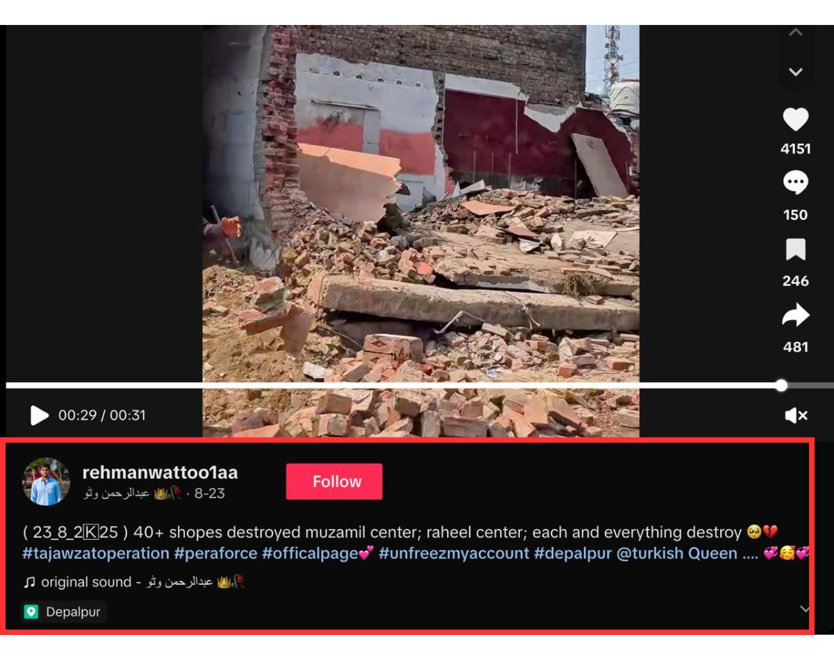 इसके अलावा, हमें वायरल वीडियो जैसे ही दृश्य दिखाने वाला वीडियो पाकिस्तानी डिजिटल आउटलेट उर्दू पॉइंट के टिकटॉक और एक्स अकाउंट पर भी मिला, जिसमें बताया गया है कि देपालपुर में 50 साल पुरानी दुकानें गिरा दी गई हैं.