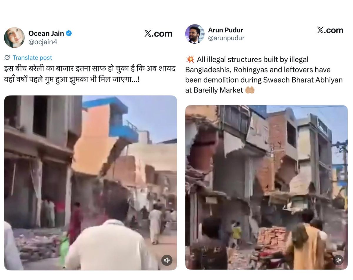 एक्स पर अरुण पुदुर नाम के यूज़र ने वीडियो पोस्ट करते हुए लिखा, “बरेली बाजार में स्वच्छ भारत अभियान के दौरान अवैध बांग्लादेशियों, रोहिंग्याओं और बचे हुए लोगों द्वारा बनाए गए सभी अवैध ढांचों को ध्वस्त कर दिया गया है.” पोस्ट का आर्काइव यहां देखें. वहीं, ज़्यादातर यूज़र्स वीडियो को इस कैप्शन के साथ शेयर कर रहे हैं: “बरेली का बाजार इतना साफ हो गया है कि कई वर्षों पहले गिरा हुआ झुमका भी शायद अब मिल जाएगा.” इन पोस्ट्स के आर्काइव यहां, यहां, यहां और यहां देखें.