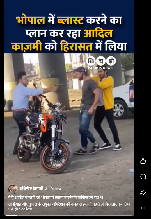 वायरल वीडियो 18 सेकेंड का है, जिसमें सादे कपड़ों में मौजूद दो व्यक्ति एक बाइक सवार को बंदूक की नोक पर अपने कब्जे में लेते हुए दिखाई दे रहे हैं. इसके बाद एक पुलिस की गाड़ी वहां आती है और उस बाइक सवार को उसमें बिठा लेती है. वीडियो में एक टेक्स्ट भी मौजूद है, जिसमें लिखा हुआ है “भोपाल में ब्लास्ट करने का प्लान कर रहा आदिम काजमी को हिरासत में लिया.”