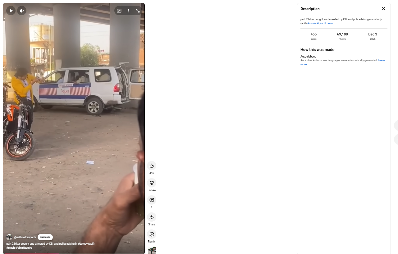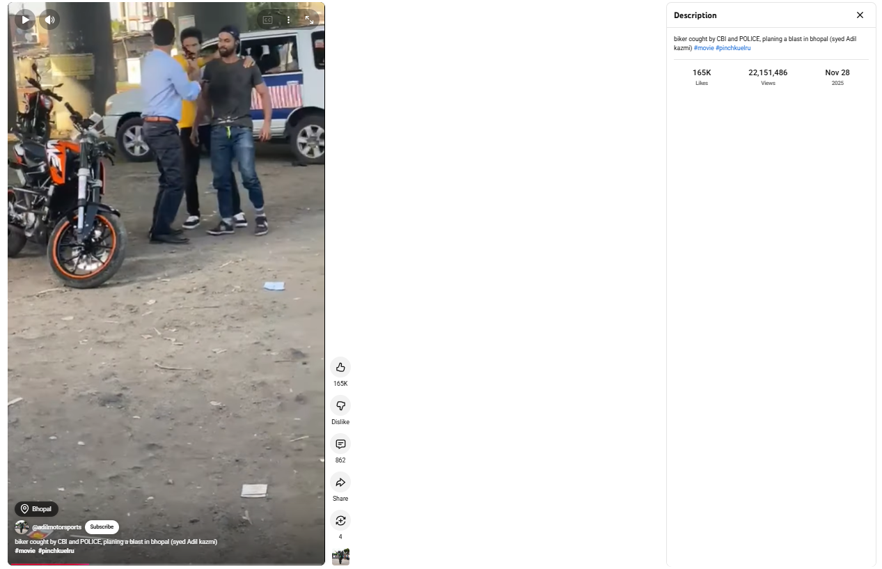 भोपाल में ब्लास्ट करने की साजिश रच रहे आदिल काजमी को गिरफ्तार किए जाने के दावे से वायरल इस वीडियो की पड़ताल के दौरान, कीफ्रेम की मदद से रिवर्स इमेज सर्च करने पर यह वीडियो adimotorsports नाम के एक यूट्यूब अकाउंट से 28 नवंबर 2025 को अपलोड किया गया मिला. वीडियो के साथ मौजूद कैप्शन में लिखा हुआ था, “biker cought by CBI and POLICE, planing a blast in bhopal (syed Adil kazmi) #movie #pinchkuelru”.