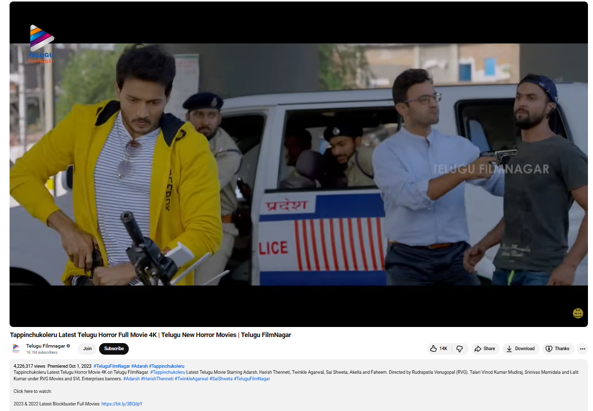 चूंकि, दोनों ही टाइटल में pinchkuelru नाम की एक फिल्म का हैशटैग मौजूद था, इसलिए इस कीवर्ड की मदद से गूगल सर्च किया तो हमें मिलते-जुलते नाम वाला Tappinchukoleru फिल्म का पूरा वीडियो तेलुगु फिल्मनगर नाम के यूट्यूब अकाउंट से 1 अक्टूबर 2023 को अपलोड किया हुआ मिला.