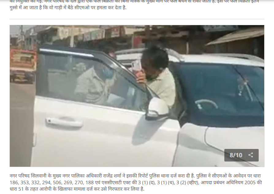 बिहार में फल विक्रेता द्वारा सीएमओ की पिटाई का बताकर शेयर किए गए वीडियो की पड़ताल के लिए हमने इसके कीफ्रेम्स को रिवर्स सर्च किया। इस दौरान हमें आजतक की वेबसाइट पर 6 मई 2021 को प्रकाशित रिपोर्ट मिली। इस खबर में वायरल वीडियो के दृश्य मौजूद हैं और इस घटना को मध्य प्रदेश के रायसेन का बताया गया है। रिपोर्ट के अनुसार, बिना मास्क के फल बेच रहे ठेले वाले को रोके जाने पर वह गुस्से में आ गया और वहां मौजूद सीएमओ (नोडल अधिकारी) पर हमला कर दिया। इस मामले में सीएमओ की शिकायत के बाद आपदा प्रबंधन अधिनियम-2005 सहित कई अन्य धाराओं में मामला दर्ज कर पुलिस ने फल विक्रेता को गिरफ्तार किया था।