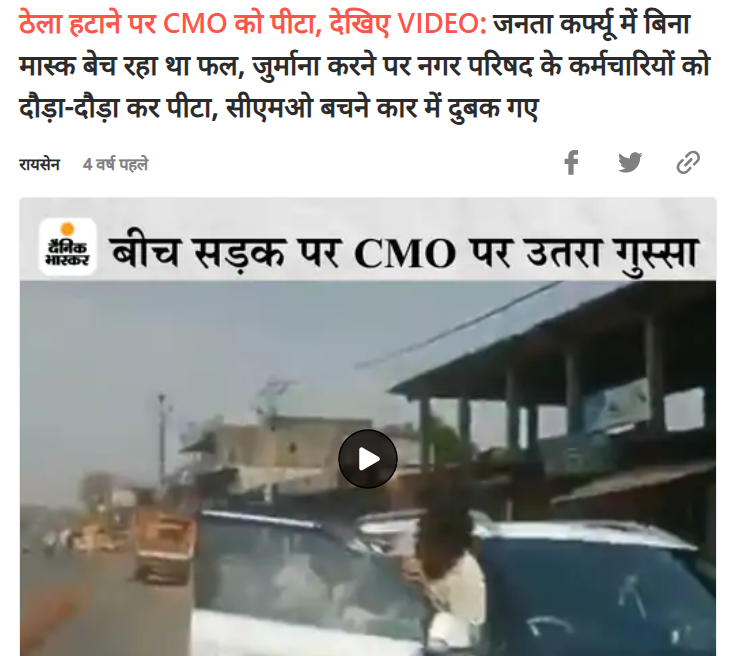 खोजने पर हमें दैनिक भास्कर द्वारा साल 2021 में वायरल वीडियो पर प्रकाशित रिपोर्ट मिली। इस रिपोर्ट में वीडियो भी मौजूद है। इस खबर में भी इस घटना को मध्य प्रदेश के रायसेन का बताया गया है। बतौर रिपोर्ट, जनता कर्फ्यू के दौरान बिना मास्क लगाए फल बेच रहे फल विक्रेता का जुर्माना करने पर वह गुस्से में आ गया और उसने वहां मौजूद अधिकारियों के साथ मारपीट की। इसके बाद तत्कालीन सीएमओ राजेंद्र शर्मा ने फल विक्रेता सलीम उद्दीन के खिलाफ सिलवानी थाने में रिपोर्ट दर्ज कराई थी।