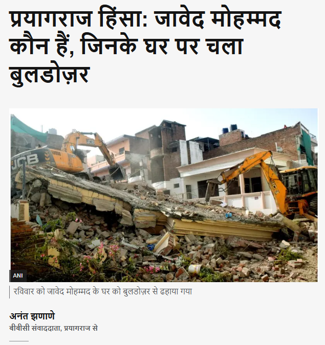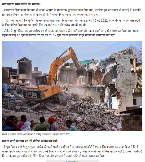 इस रिपोर्ट में भी बताया गया था कि नूपुर शर्मा द्वारा की गई आपत्तिजनक टिप्पणी के बाद 10 जून को प्रयागराज में हिंसा भड़क गई थी. इस दौरान भीड़ ने कई गाड़ियों में आग भी लगा दिया था. इस हिंसा के बाद प्रयागराज प्रशासन ने करेली इलाके में मौजूद जावेद के घर को ढहा दिया था. मकान ढहाने के बाद जावेद की पत्नी ने इलाहबाद हाईकोर्ट में याचिका दायर की थी.