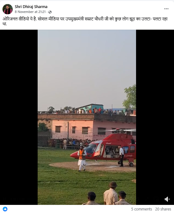 हेलीकॉप्टर से उतरने के बाद सम्राट चौधरी के जमीन पर गिरने के दावे से वायरल इस वीडियो की पड़ताल के दौरान, हमें बिहार के एक पत्रकार धीरज शर्मा के फेसबुक अकाउंट से 8 नवंबर 2025 को अपलोड किया गया वीडियो मिला, जिसमें मौजूद दृश्य वायरल वीडियो से मेल खा रहे थे. हालांकि, इस वीडियो में सम्राट चौधरी हेलीकॉप्टर से उतरने के बाद गिरते हुए नहीं, बल्कि वहां मौजूद नेताओं से मुलाक़ात करते नजर आ रहे थे.