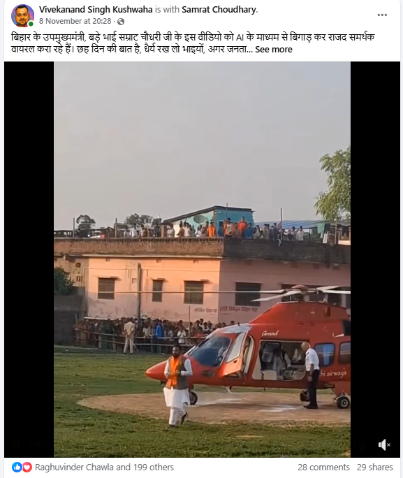 यही वीडियो हमें एक और पत्रकार विवेकानंद सिंह कुशवाहा के फेसबुक अकाउंट से भी 8 नवंबर 2025 को पोस्ट किया गया मिला. इस वीडियो में भी सम्राट चौधरी गिरते हुए नहीं, बल्कि सामान्य तरीके से हेलीकॉप्टर से बाहर आने के बाद नेताओं से मुलाक़ात करते हुए दिख रहे थे.
