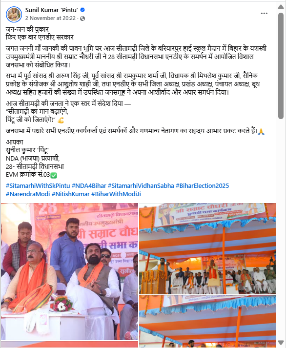 इसके बाद जांच में हमने पाया कि सम्राट चौधरी ने 2 नवंबर 2025 को सीतामढ़ी के बरियारपुर हाई स्कूल मैदान में आयोजित एक जनसभा को संबोधित किया था. सीतामढ़ी के भाजपा उम्मीदवार सुनील कुमार पिंटू ने भी इन तस्वीरों को अपने फेसबुक अकाउंट पर शेयर किया था