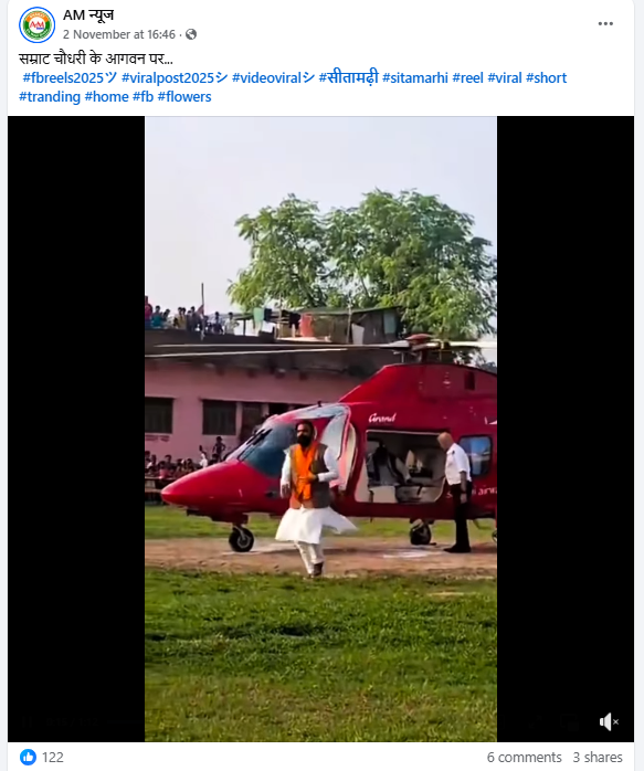 जांच में हमें सीतामढ़ी के एक न्यूज पोर्टल के फेसबुक अकाउंट से भी 2 नवंबर 2025 को पोस्ट किया गया वीडियो मिला, जिसमें सम्राट चौधरी हेलीकॉप्टर से निकलने के बाद भाजपा उम्मदीवार सुनील कुमार पिंटू सहित अन्य नेताओं से मुलाक़ात करते नजर आ रहे हैं.