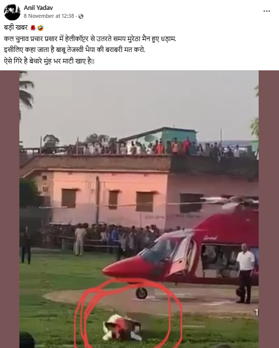 वीडियो को X पर वायरल दावे वाले कैप्शन के साथ शेयर किया गया है, जिसमें लिखा हुआ है, “कल चुनाव प्रचार प्रसार में हेलीकॉप्टर से उतरते समय मुरेठा मैन हुए धड़ाम. इसीलिए कहा जाता है बाबू तेजस्वी भैया की बराबरी मत करो. ऐसे गिरे है बेचारे मुंह भर माटी खाए है”.