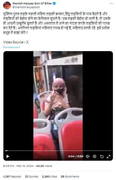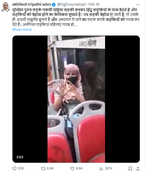 एक एक्स पोस्ट में इस वीडियो को शेयर करते हुए लिखा गया कि ‘मुस्लिम पुरुष लड़के नकली महिला लड़की बनकर,हिंदू लड़कियों के पास बैठते है और लड़कियों को बेहोश होने का केमिकल सुंघाते है। जब लड़की बेहोश हो जाती है, तो उसके ही आदमी एम्बुलेंस बुलाते हैं और अस्पताल ले जाने का नाटक करके लड़कियों को गायब कर देते हैं। अनगिनत लड़कियां महिलाएं गायब हो गई हैं, महिलाएं सतर्क रहें. इसे प्रत्येक समूह में साझा करें।’