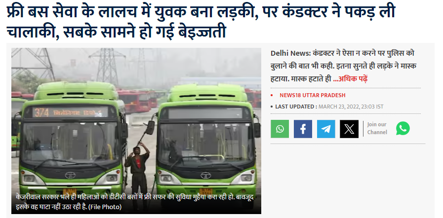 जांच में हमने पाया कि वायरल दावा भ्रामक है। इस घटना पर प्रकाशित रिपोर्ट्स में दी गयी जानकारी के अनुसार, युवक दिल्ली की मुफ्त बस सेवा का लाभ लेने के लिए लड़की बनकर यात्रा कर रहा था।