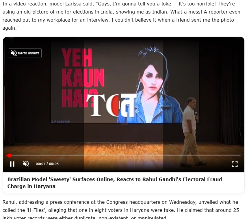 हमारी जांच में मिले साक्ष्यों से यह स्पष्ट है कि राहुल गांधी पर ब्राजीलियन मॉडल द्वारा निशाना साधे जाने का दावा फर्जी है. असल में मॉडल लेरिसा नेरी वीडियो के माध्यम से भारतीय वोटर लिस्ट में अपनी तस्वीर होने पर आश्चर्य जता रही थीं.