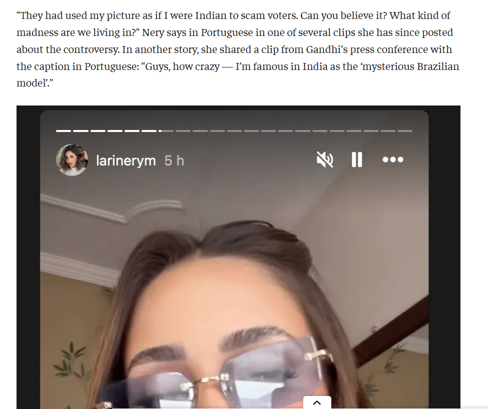 राहुल गांधी पर ब्राजीलियन मॉडल द्वारा निशाना साधे जाने के दावे से वायरल इस वीडियो की पड़ताल के दौरान, हमें यह वीडियो कई मीडिया संस्थानों की वेबसाइट पर प्रकाशित रिपोर्ट्स में मिला. यह वीडियो लेरिसा नेरी ने अपने इंस्टाग्राम अकाउंट से स्टोरी के रूप में शेयर किया था.