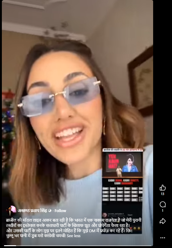 सोशल मीडिया पर राहुल गांधी के ‘वोट चोरी‘ के मुद्दे से चर्चा में आई एक ब्राजीलियन मॉडल का वीडियो इस दावे से शेयर किया जा रहा है कि उन्होंने राहुल गांधी को नाकाम नेता बताते हुए कहा है कि वह मेरी पुरानी तस्वीरों का इस्तेमाल करके सत्ताधारी पार्टी के खिलाफ झूठ और प्रोपेगैंडा फैला रहे हैं.