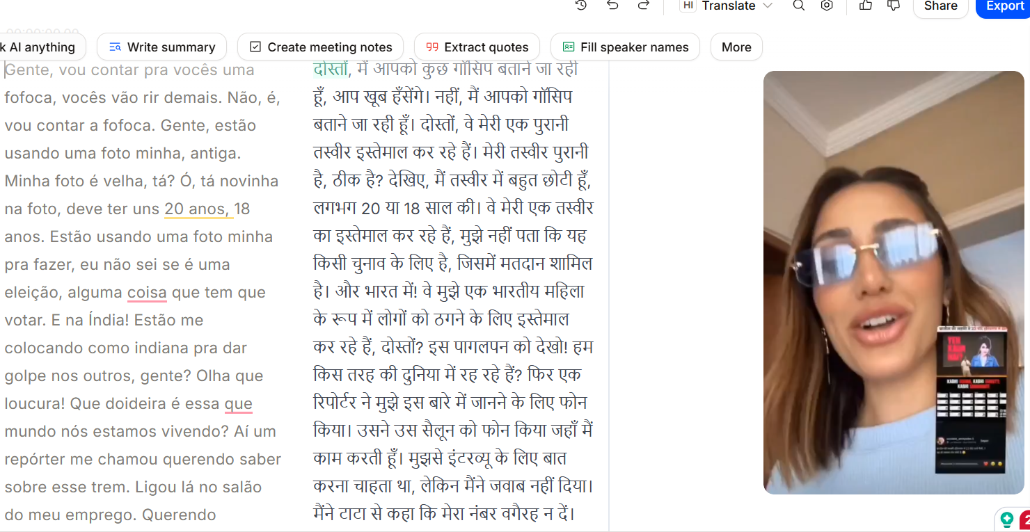 चूंकि, ब्राज़ीलियन मॉडल का यह वीडियो पुर्तगाली भाषा में था, इसलिए हमने Turbo Scribe की मदद से वीडियो का ट्रांसक्रिप्शन किया और फिर उसका हिंदी अनुवाद किया.