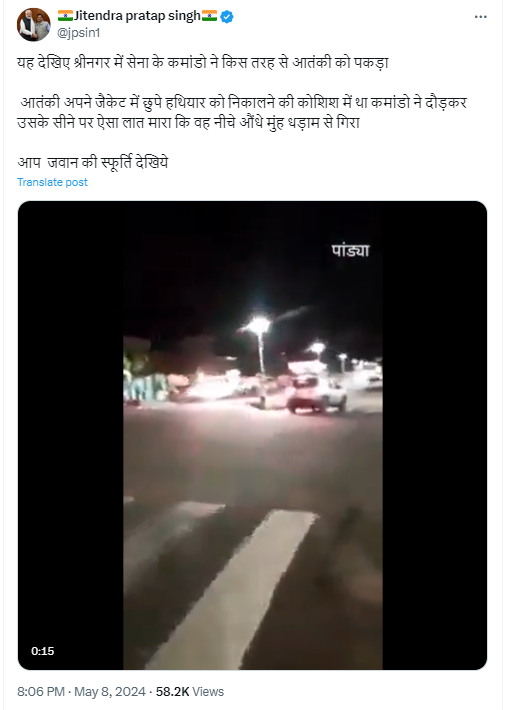 वीडियो को वायरल दावे वाले कैप्शन के साथ शेयर किया गया है, जिसमें लिखा हुआ है “यह देखिए श्रीनगर में सेना के कमांडो ने किस तरह से आतंकी को पकड़ा. आतंकी अपने जैकेट में छुपे हथियार को निकालने की कोशिश में था कमांडो ने दौड़कर उसके सीने पर ऐसा लात मारा कि वह नीचे औंधे मुंह धड़ाम से गिरा. आप जवान की स्फूर्ति देखिये”.