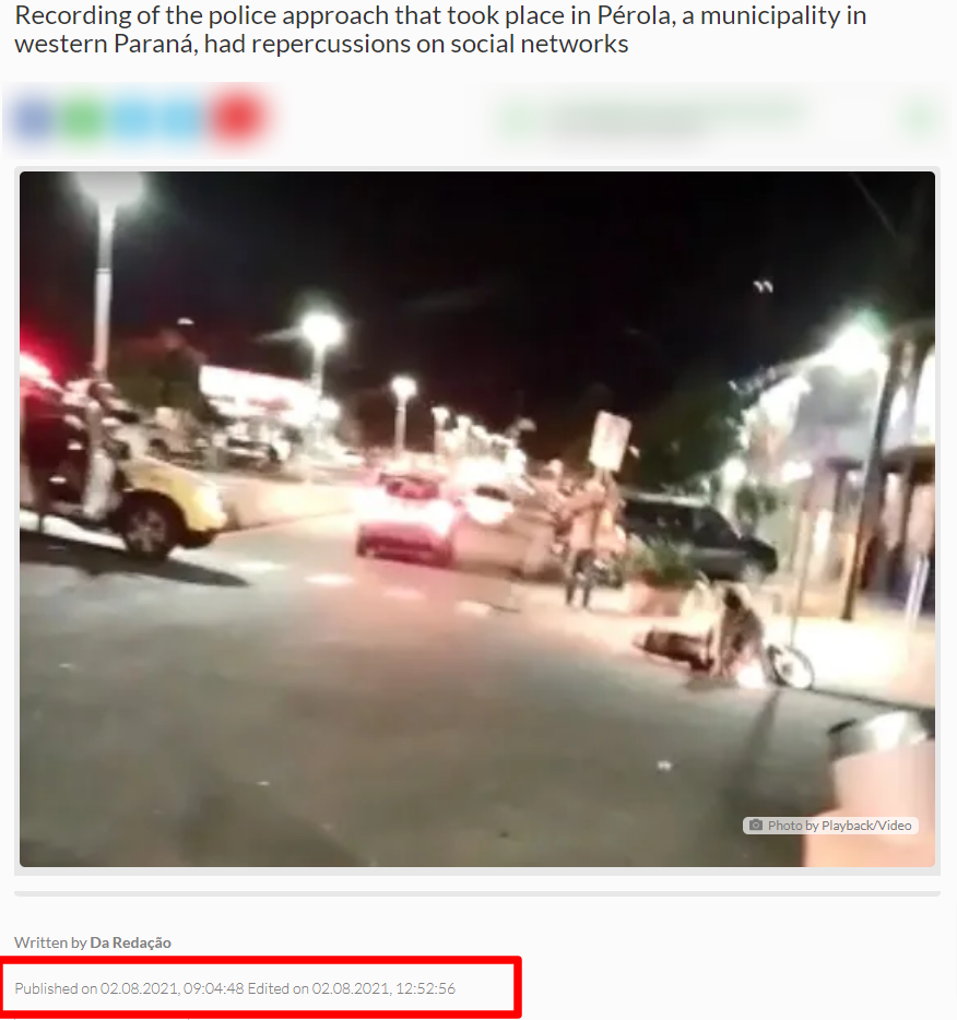 संबंधित कीवर्ड को गूगल सर्च करने पर हमें TN Online नाम की वेबसाइट पर 2 अगस्त 2021 को प्रकाशित रिपोर्ट भी मिली थी, जिसमें वायरल वीडियो से जुड़ा दृश्य फीचर इमेज के रूप में मौजूद था. इस रिपोर्ट में बताया गया था कि ब्राजील के पेरोला शहर में मिलिट्री पुलिस गश्त कर रही थी तभी एक 17 वर्षीय बाइक सवार का व्यवहार संदिग्ध दिखा. जब पुलिस ने उसे रोकने की कोशिश की तो वह भागने लगा. इस दौरान पुलिस गाड़ी से उस बाइक की टक्कर हो गई और उक्त बाइक सवार ने अपना संतुलन खो दिया. हालांकि, इस दौरान वह उठकर भागने की कोशिश करने लगा तभी एक पुलिसकर्मी ने उसके सीने पर जबरदस्त चोट मारी.