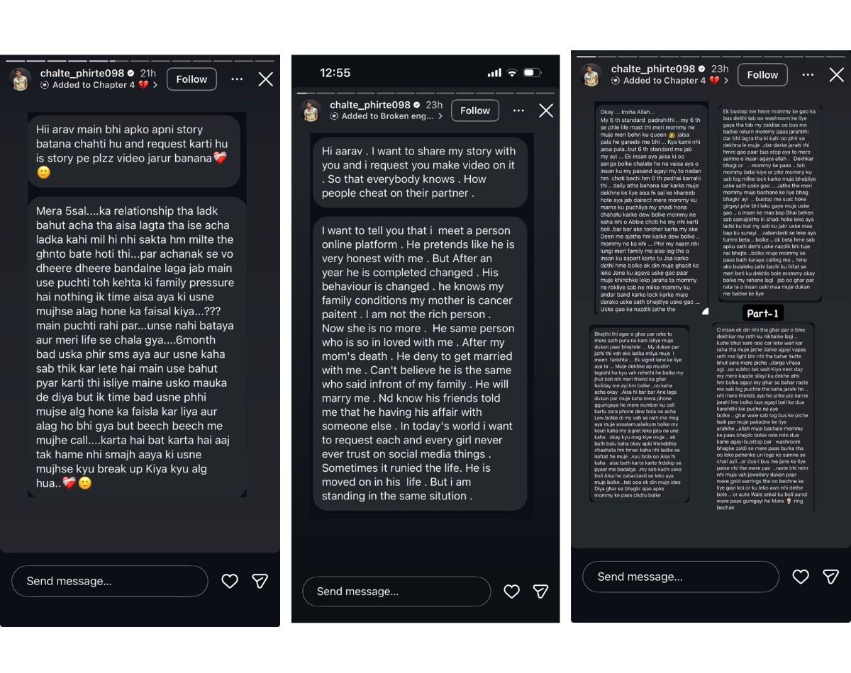 हमने आरव मावी की इंस्टाग्राम स्टोरीज़ को भी देखा, जहां उन्होंने कई लोगों के मैसेज के स्क्रीनशॉट शेयर किए हैं, जिनमें लोग उनसे अपनी कहानियों पर वीडियो बनाने का अनुरोध कर रहे हैं.