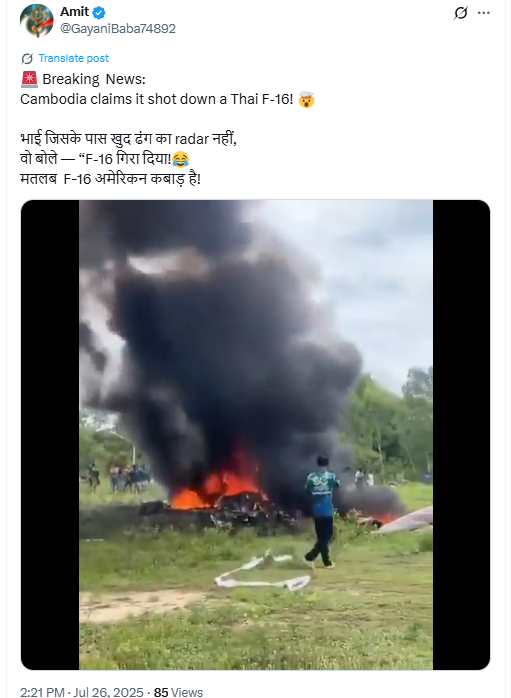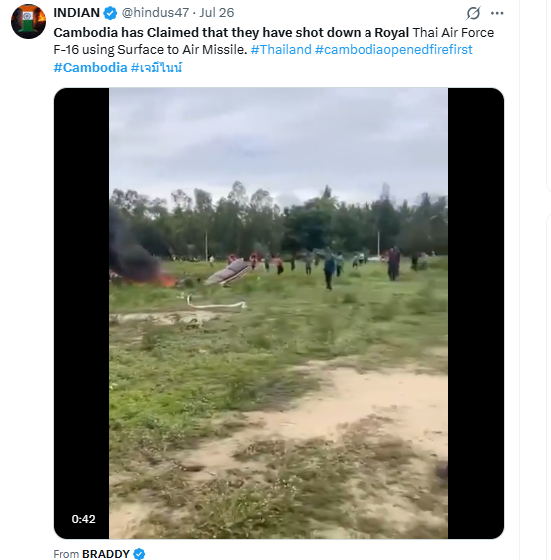 वीडियो को X पर वायरल दावे वाले अंग्रेजी कैप्शन के साथ शेयर किया गया है, जिसमें लिखा हुआ है “कंबोडिया ने दावा किया है कि उन्होंने थाईलैंड की रॉयल एयर फोर्स के एक F-16 विमान को सरफेस-टू-एयर मिसाइल से मार गिराया है.”