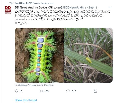 दावे की सत्यता जानने के लिए हमने कोलाज में मौजूद तस्वीरों की पड़ताल की। हमें डीडी न्यूज के अधिकारिक ट्विटर हैंडल से किया गया एक ट्वीट मिला। ट्वीट में वायरल तस्वीर मौजूद है और कृषि विज्ञान केंद्र के हवाले से दावे को फर्जी बताया गया है। साथ ही यह भी लिखा गया है कि यह कीड़ा अधिकांशत: गन्ने के खेत में पाया जाता है और इसके काटने से शरीर में खुजली या जलन होती है, मृत्यु नहीं होती। डीडी न्यूज के इस ट्वीट को आंध्र प्रदेश सरकार के आधिकारिक फैक्ट चेक ट्विटर हैंडल ने रिट्वीट भी किया है।