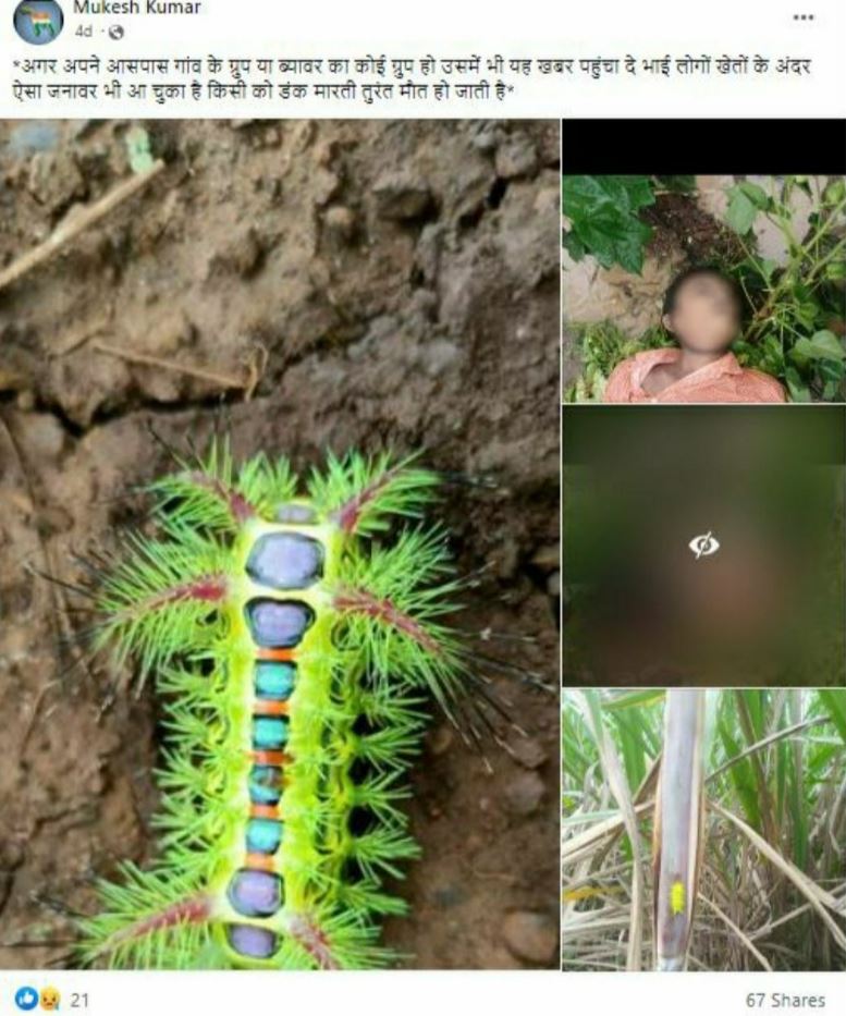 पिछले कुछ दिनों से सोशल मीडिया पर एक कोलाज वायरल है। इसमें दो तस्वीरें है। एक तस्वीर में हरे रंग का कीड़ा दिखाई दे रहा है और दूसरी तस्वीर में दो शव। कोलाज को शेयर कर यूजर्स कीड़े से सावधान रहने को कह रहे हैं। दावा किया जा रहा कि इस कीड़े के काटने के तुरंत बाद ही मौत हो जाती है।