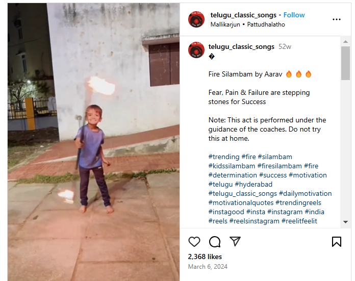 पोस्ट में मौजूद कैप्शन में बताया गया था कि वीडियो में दिख रहे बच्चे का नाम आरव है और वह तमिलनाडु की पुरानी मार्शल आर्ट तकनीक सिलंबम की प्रैक्टिस कर रहा है. इसके अलावा वीडियो में आरव और एक सिलंबम अकेडमी का अकाउंट भी टैग था.