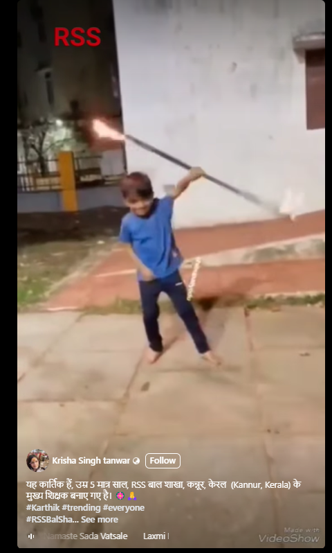 सोशल मीडिया पर आग और लाठी से करतब दिखाते एक बच्चे का वीडियो इस दावे से शेयर किया जा रहा है कि बच्चे का नाम कार्तिक है, जिसे 5 साल की उम्र में ही केरल के कन्नूर में आरएसएस बाल शाखा का मुख्य शिक्षक बनाया गया है.