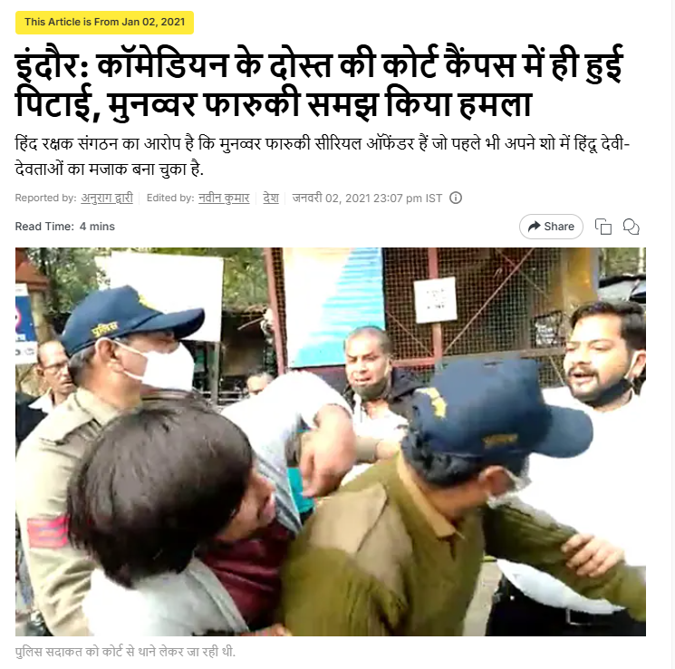 रिपोर्ट में बताया गया था कि जनवरी 2021 में इंदौर के मुनरो कैफे में आयोजित हुए स्टैंडअप कॉमेडियन मुनव्वर फारुकी के शो में हिंदू देवी-देवताओं का मजाक उड़ाने का आरोप लगा था, जिसका कुछ हिंदू संगठनों ने विरोध किया था. इस विरोध के बाद मुनव्वर पर मामला दर्ज हुआ था और इसी मामले में उनको गिरफ्तार भी किया गया था.