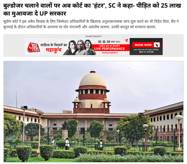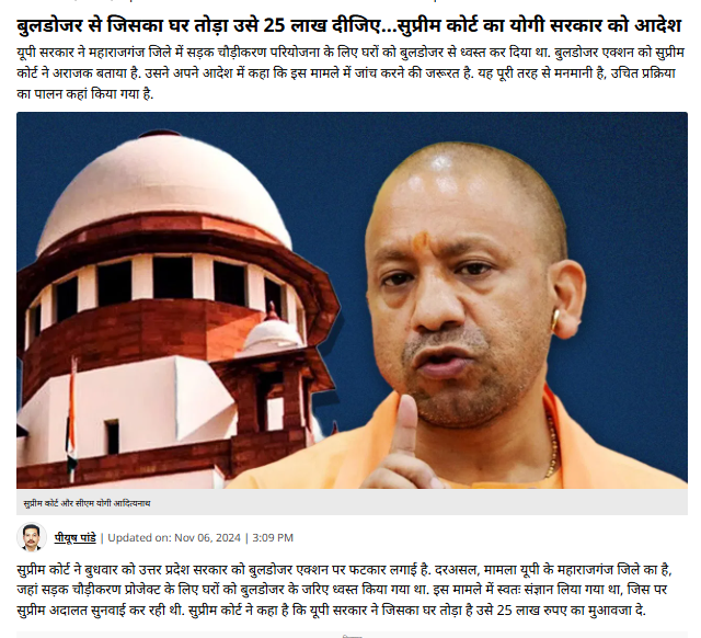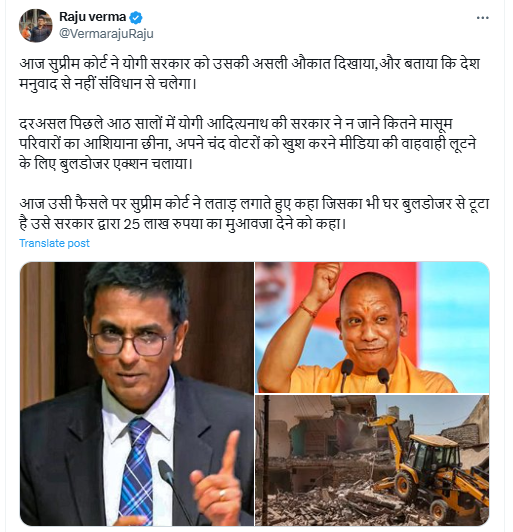 6 नवंबर 2024 को एक एक्स पोस्ट (आर्काइव) में कहा गया है, “आज सुप्रीम कोर्ट ने योगी सरकार को उसकी असली औकात दिखाया,और बताया कि देश मनुवाद से नहीं संविधान से चलेगा। दरअसल पिछले आठ सालों में योगी आदित्यनाथ की सरकार ने न जाने कितने मासूम परिवारों का आशियाना छीना, अपने चंद वोटरों को खुश करने मीडिया की वाहवाही लूटने के लिए बुलडोजर एक्शन चलाया। आज उसी फैसले पर सुप्रीम कोर्ट ने लताड़ लगाते हुए कहा जिसका भी घर बुलडोजर से टूटा है उसे सरकार द्वारा 25 लाख रुपया का मुआवजा देने को कहा।“