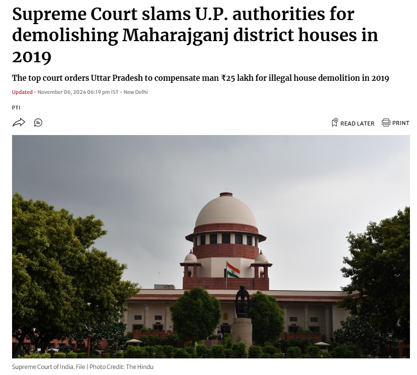 7 नवंबर 2024 को आज तक द्वारा प्रकाशित रिपोर्ट में बताया गया है कि ‘उत्तर प्रदेश के महाराजगंज में हाईवे के किनारे बने एक घर को बिना किसी तय प्रक्रिया का पालन किए बुलडोजर से जमींदोज किए जाने पर सुप्रीम कोर्ट ने यूपी सरकार को कड़ी फटकार लगाई है। सुप्रीम कोर्ट ने सड़क चौड़ीकरण के नाम पर अवैध तरीके से मकान ध्वस्त करने के लिए जिम्मेदार अधिकारियों के खिलाफ विभागीय और प्रशासनिक के साथ कानूनी कार्रवाई करने को कहा है।’