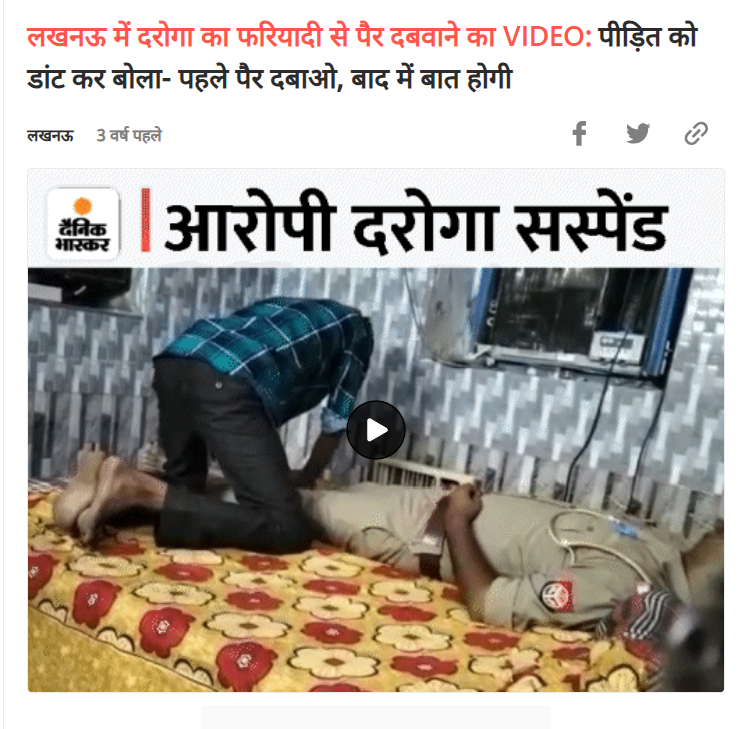 लखनऊ में फरियादी से पैर दबवाते दारोगा के दावे से वायरल हुए वीडियो की पड़ताल के लिए हमने इसके कीफ्रेम्स को रिवर्स सर्च किया। इस दौरान हमें 29 अगस्त 2022 को दैनिक भास्कर द्वारा प्रकाशित रिपोर्ट मिली। इस रिपोर्ट में वायरल वीडियो मौजूद है। रिपोर्ट में बताया गया है कि यह वीडियो लखनऊ के ठाकुरगंज का है, जहां फ़रियाद लेकर पहुंचे एक व्यक्ति से गऊ घाट चौकी प्रभारी गोरखनाथ चौधरी ने पैर दबवाया था।