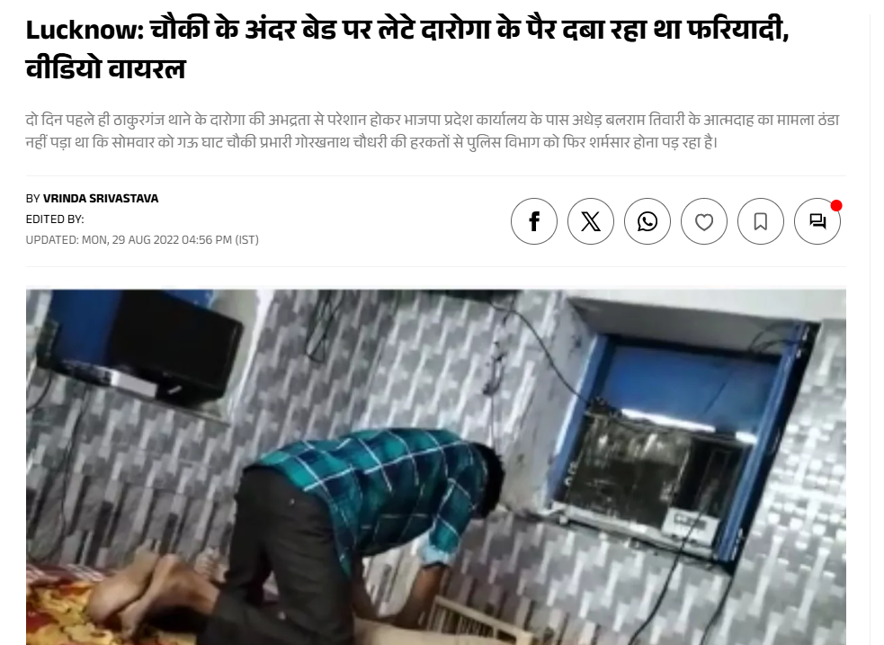फरियादी से पैर दबवाते दारोगा के इस वीडियो पर 30 अगस्त 2022 को टीवी9 भारतवर्ष ने भी खबर प्रकाशित की थी, जिसे यहां पढ़ा जा सकता है।