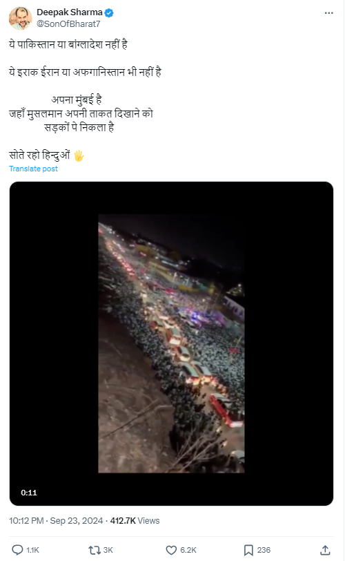 भाजपा नेता नितेश राणे और रामगिरि महाराज ने पिछले दिनों इस्लाम और पैगंबर मोहम्मद पर कथित रूप से अपमानजनक टिप्पणियां की थी। इसके लिए उनके खिलाफ कार्रवाई की मांग को लेकर पूर्व सांसद और एआईएमआईएम नेता इम्तियाज जलील ने सोमवार, 23 सितंबर को मुंबई नागपुर समृद्धि एक्सप्रेसवे के रास्ते मुंबई तक ‘तिरंगा संविधान’ रैली का आह्वान किया था। इसी बीच सोशल मीडिया पर करीब 28 सेकंड का एक वीडियो इस रैली से जोड़कर शेयर किया जा रहा है। वीडियो में सड़क पर भारी जनसैलाब नजर आ रहा है। 23 सितंबर 2024 को यह वीडियो एक्स पर शेयर करते हुए कैप्शन में लिखा गया है, “ये पाकिस्तान या बांग्लादेश नहीं है, ये इराक ईरान या अफगानिस्तान भी नहीं है, अपना मुंबई है… जहाँ मुसलमान अपनी ताकत दिखाने को सड़कों पे निकला हैं. .. सोते रहो हिन्दुओं।” एक्स पोस्ट का आर्काइव यहाँ देखें। इस दावे के साथ शेयर किया गया फेसबुक पोस्ट यहाँ देखें।