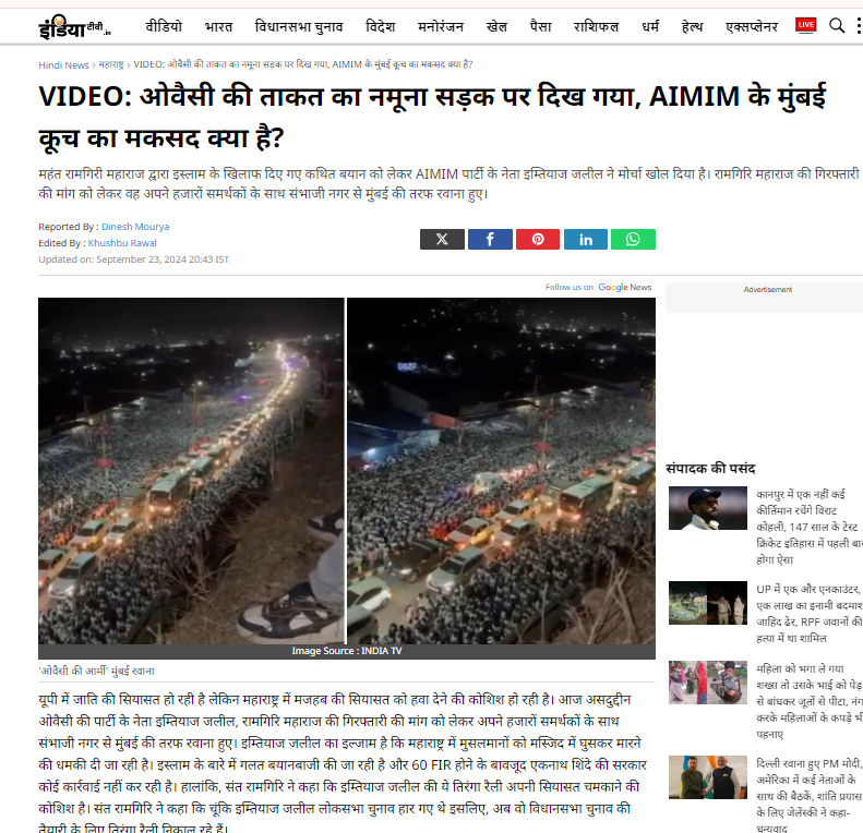 इंडिया टीवी और फ्री प्रेस जर्नल की रिपोर्ट में भी इस वीडियो को इम्तियाज़ जलील द्वारा निकाली गई रैली का बताकर शेयर किया गया है।