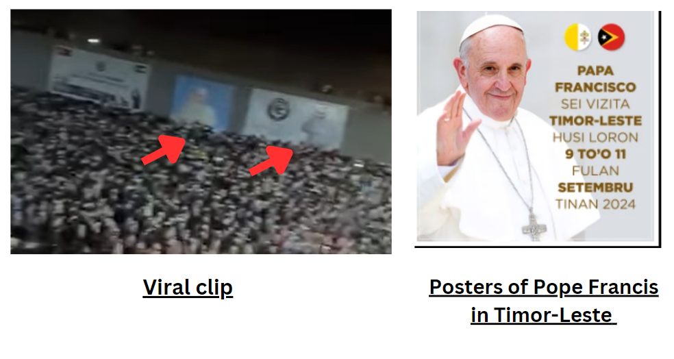 वायरल क्लिप को गौर से देखने पर हमने पाया कि सड़क के किनारे जो पोस्टर लगे हैं, उनमें नजर आ रही आकृति पोप फ्रांसिस जैसी है। तिमोर-लेस्ते देश में पोप फ्रांसिस के आगमन पर लगाए गए पोस्टर से मिलान करने पर हमें इन पोस्टर्स में समानता नजर आई।