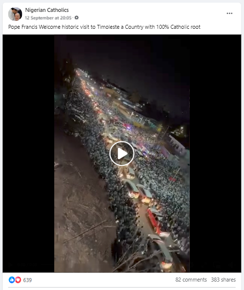यह वायरल क्लिप हमें नाइजीरियन कैथोलिक्स नामक फेसबुक पेज पर भी मिला (आर्काइव)। पोस्ट के कैप्शन में लिखा है, “पोप फ्रांसिस ने 100% कैथोलिक मूल वाले देश टिमोलेस्टे में ऐतिहासिक यात्रा की” (अनुवादित)।